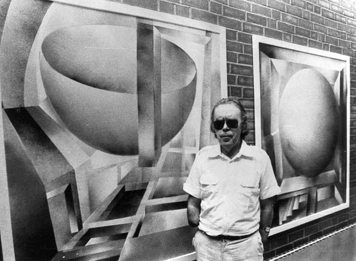 Neben dieser Arbeit mit Modellen benutzte mein Vater die Spritztechnik auch für abstrakte Darstellungen. Die Idee dazu kam ihm, als Sonnenlicht durch eine halbgeschlossene Jalousie fiel und ein Muster aus Licht und Schatten auf seinen Arbeitstisch zeichnete. Auf dieses Muster legte mein Vater gerade geschnittene Schablonen. Anschließend schuf er durch Besprühen mit Farbe ein geometrisches Abbild der Strukturen des Licht- und Schattenspiels, das er weiter bearbeitete.