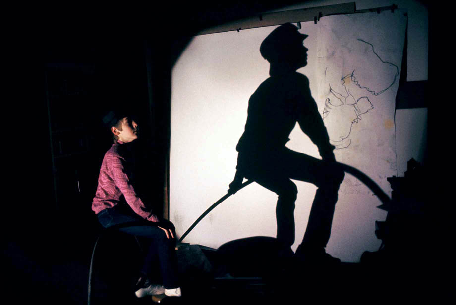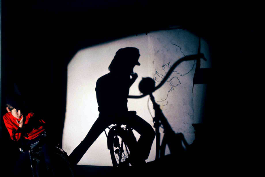 Bei den ersten Versuchen arbeitete er mit zum Teil überlebensgroßen Figuren. Die notwendigen Schablonen stellte er durch Projizieren einer Person her. Durch Anstrahlen mit einer Lichtquelle wurde ihr Schatten auf ein Papier an der Wand hinter ihr geworfen. Die Umrisse des Schattens zeichnete mein Vater mit einem Stift nach. Danach schnitt er das skizzierte Modell aus. Durch Verschieben der Lichtquelle konnte er auch bewusst Verzerrungen der abgebildeten Figur erzielen. Die Schablonen legte er nun auf den Malgrund (meist Holz oder Karton) und besprühte sie mit Farbe aus Spraydosen. Die so entstandenen Umrisse bearbeitete er weiter. Häufiges Motiv waren Personen mit Fahrrad. (Auf den Bildern aus dem Atelier bin ich als Modell zu sehen.)